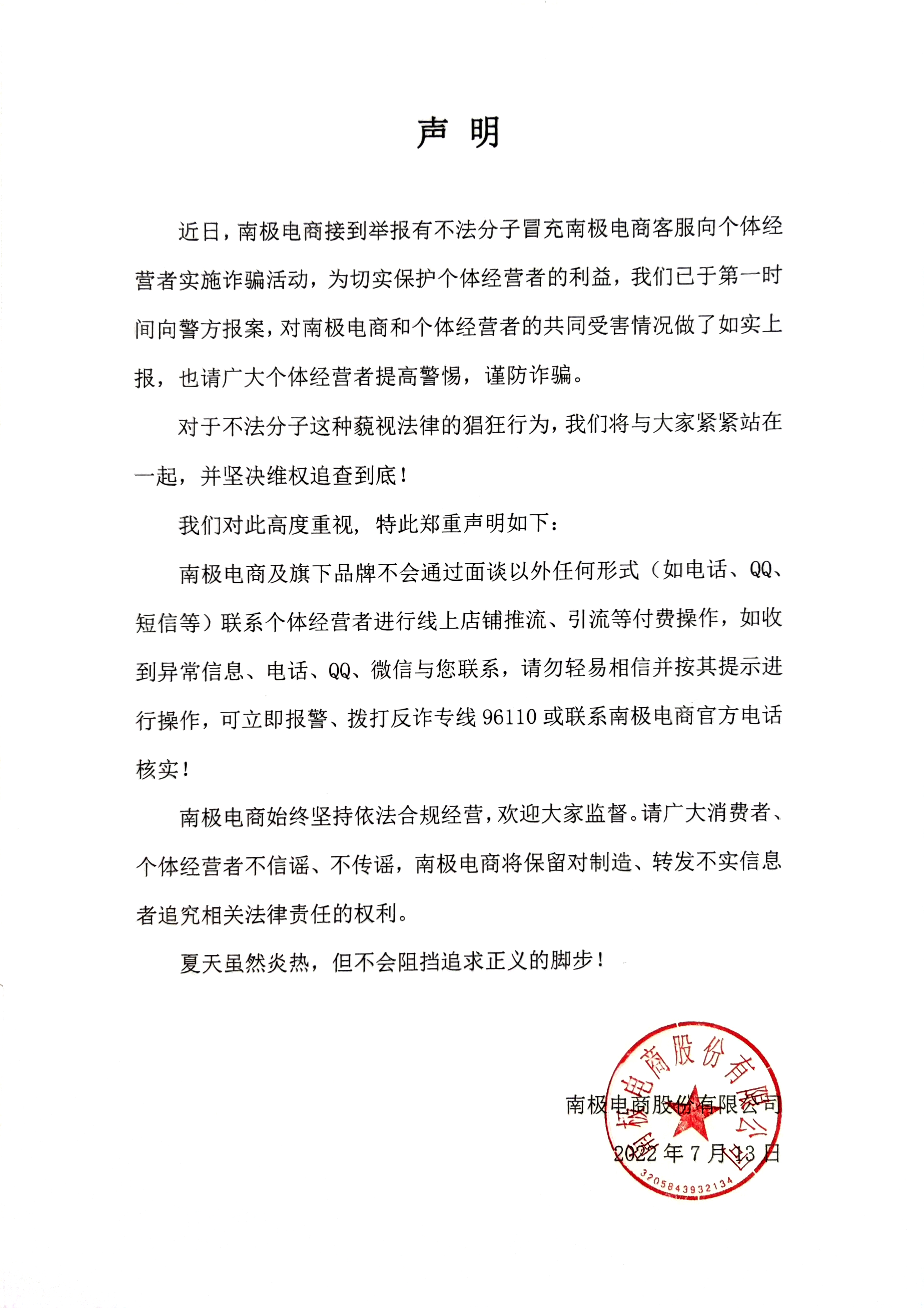 近日,南極電商接到舉報有不法分子冒充南極電商客服向個體經營者實施詐騙活動,為切實保護個體經營者的利益,我們已于第一時間向警方報案,對南極電商和個體經營者的共同受害情況做了如實上報,也請廣大個體經營者提高警惕,謹防詐騙......